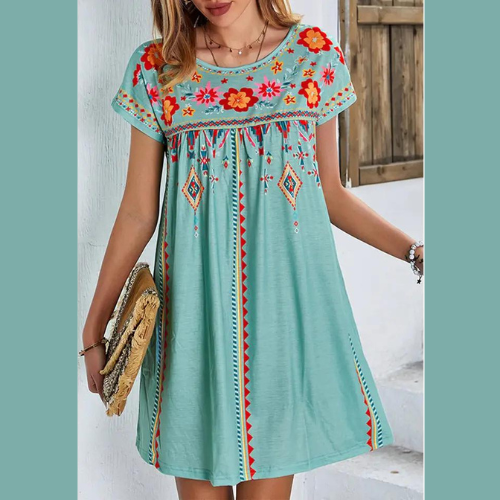 This dress is detailed with a fabulous multi-color floral boho print. Features a round neckline, short sleeves, shift dress silhouette, and above-knee length. Pair it with a straw bag and sandals for a cute look. Fits the vibe of our Sunday dresses collection. Great everyday dress